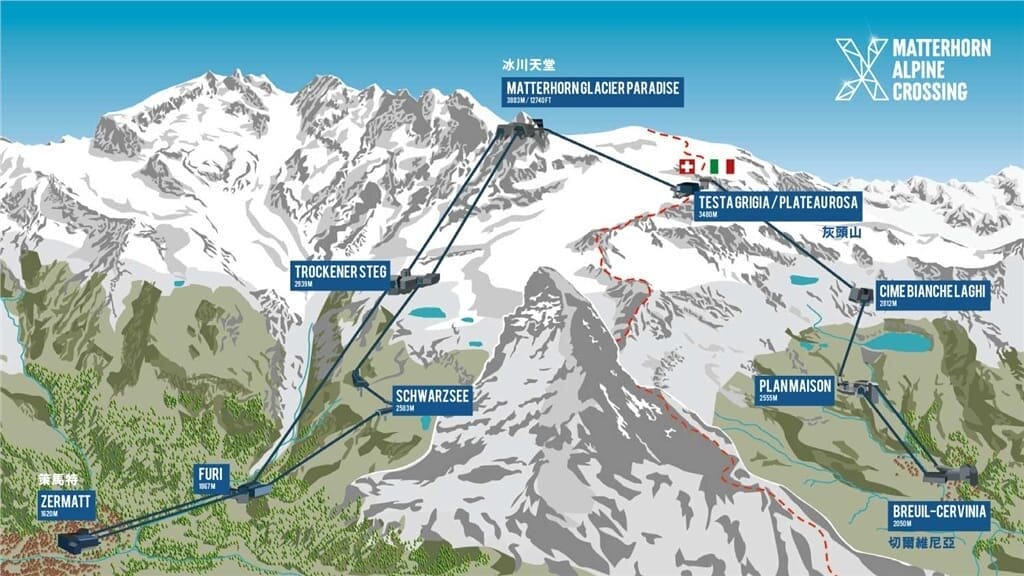 § Cervinia 山區底站為 Breuil Cervinia、峰頂站為 Testa Grigia( 又稱為 Plateau Rosa )。