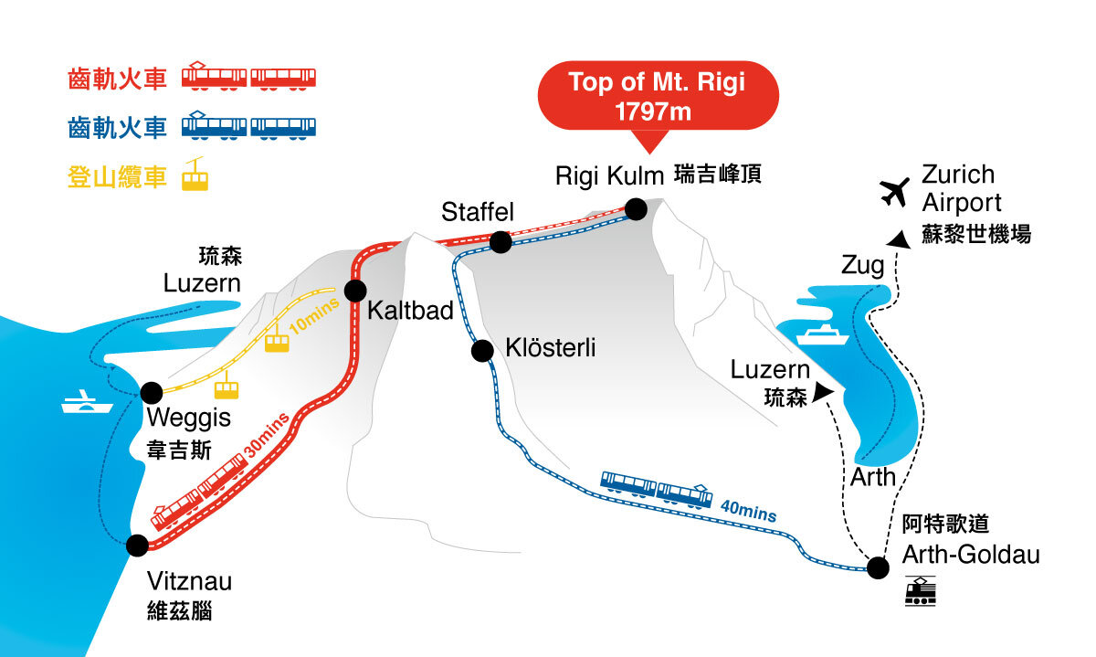瑞吉山一直是瑞士最受歡迎的山脈之一,雄偉地聳立在 Lake Lucerne 琉森湖、Lake Zug 楚格湖和 Lake Lauerz 勞爾茨湖之間。持瑞士旅行通行證可免費登山。