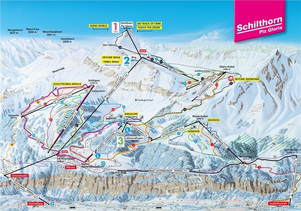 - Lauterbrunnen 出發路線:Lauterbrunnen 勞特布魯嫩 - Grütschalp - 穆倫 Mürren - Birg - 雪朗峰 Schilthorn (Piz Gloria)