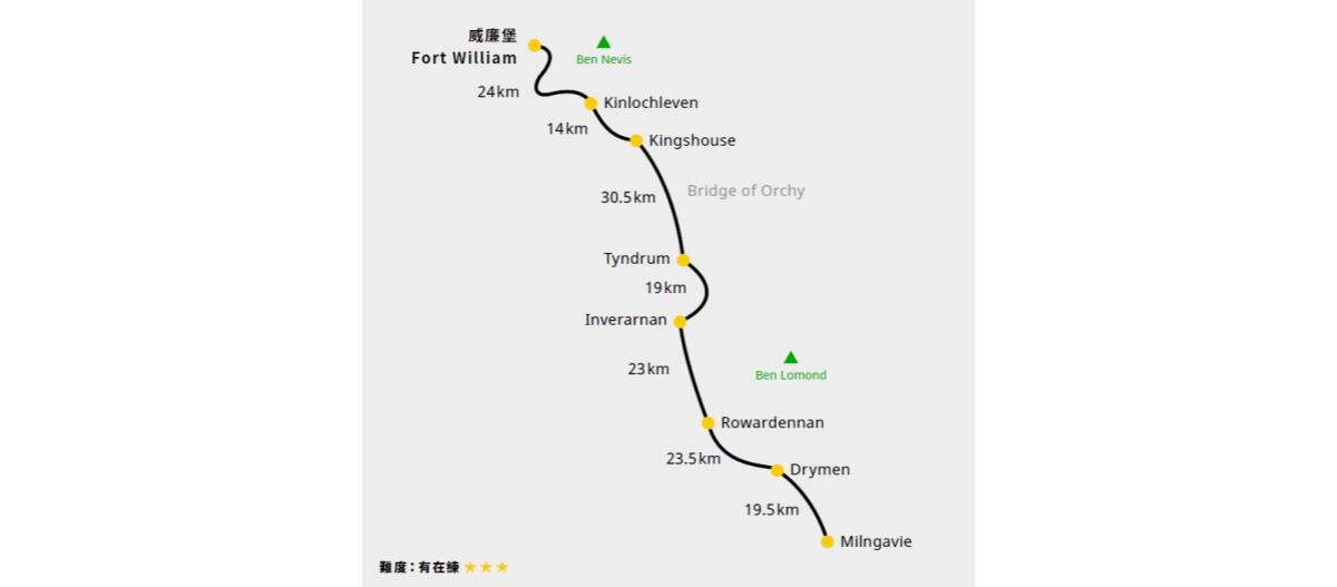 每日步行距離約 14-25 公里,單日步行時數約為 5-7 小時。我們將提供您詳盡的路線說明及 GPS 定位數據,沿途您也會看見標示著 West Highland Way 的指標。