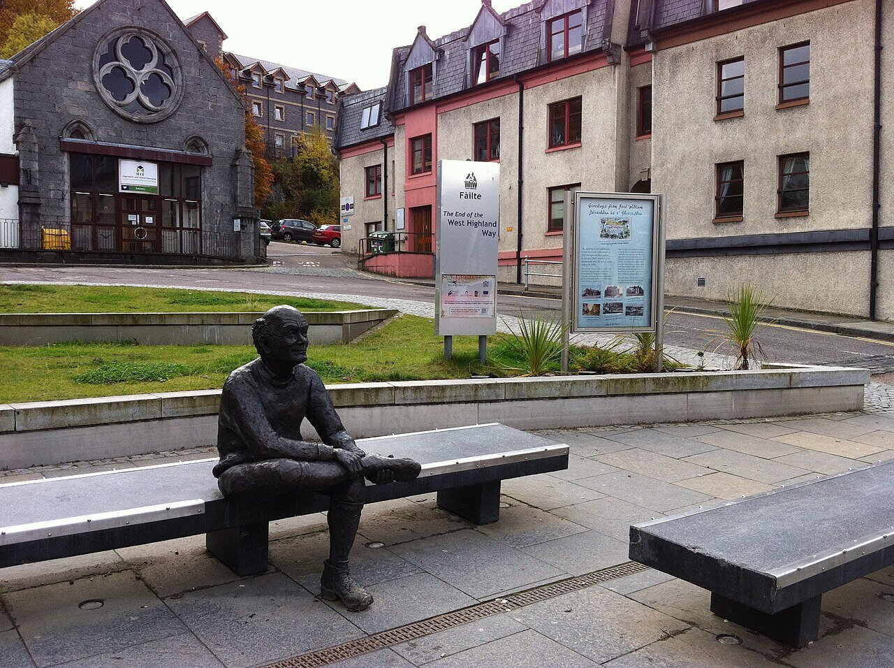 戈登廣場位於蘇格蘭高地城市威廉堡 Fort William 的中心,緊鄰主要的商業街。雖然它不是一個大型的公園或宏偉的歷史地標,但它在健行旅行界具有極高的象徵意義,因為它是兩條著名長距離步道 ( 西高地健行 West Highland Way, WHW 與 大峽谷大道 Great Glen Way, GGW ) 的官方終點。 標誌性地標:揉腳的健行者銅像 廣場上最著名的地標是一座名為「疲憊的健行者」The Tired Walker 或「揉腳的健行者」The Walker Rubbing His Feet 的青銅雕像。 這座雕像生動地捕捉了長途跋涉後的疲憊和滿足感,象徵著所有成功完成西高地健行的健行者。 對於完成長途挑戰的健行者來說,與這座雕像合影是一個必備的儀式,標誌著他們旅程的成功結束。