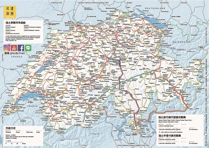 持有瑞士旅行通行證可以免費搭乘地圖上標示之火車、巴士、船