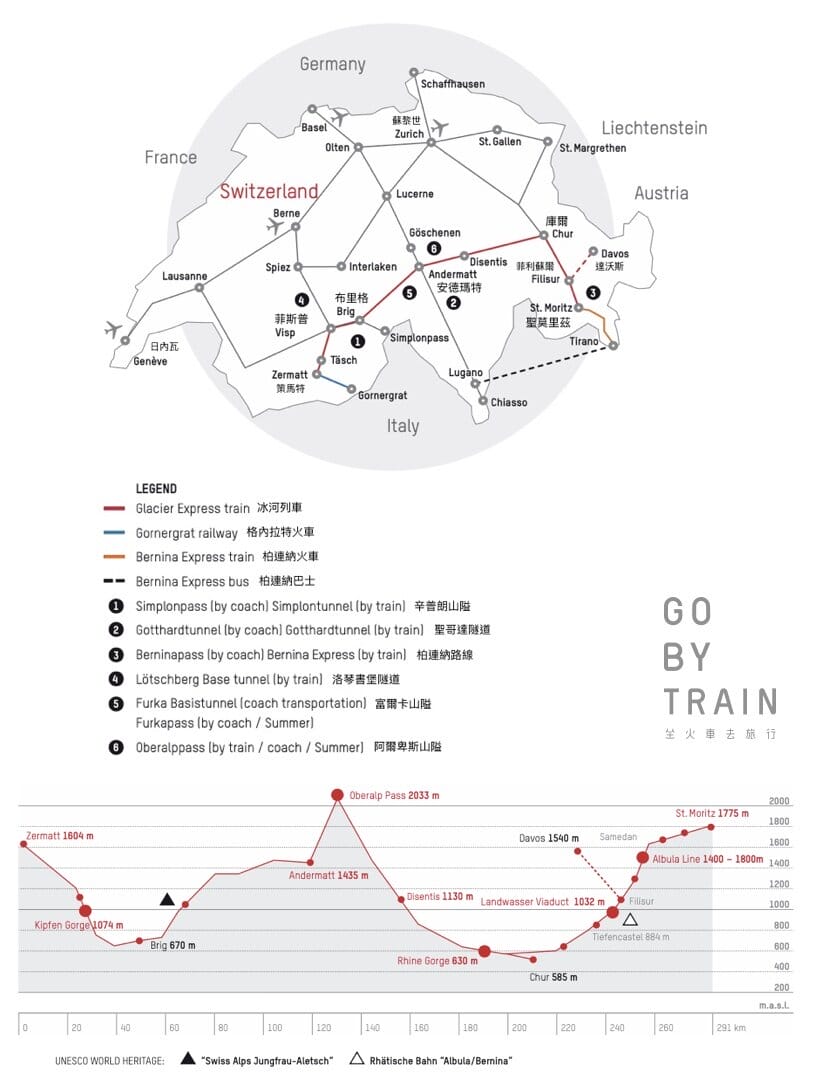 行經路線、海拔、沿途景點:Simplonpass, Lotschberg, Oberalppass...