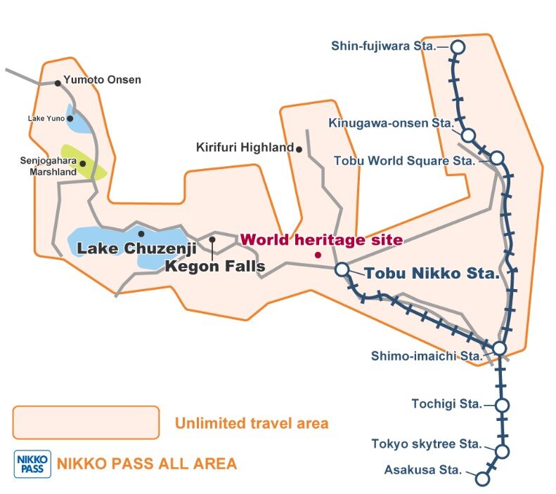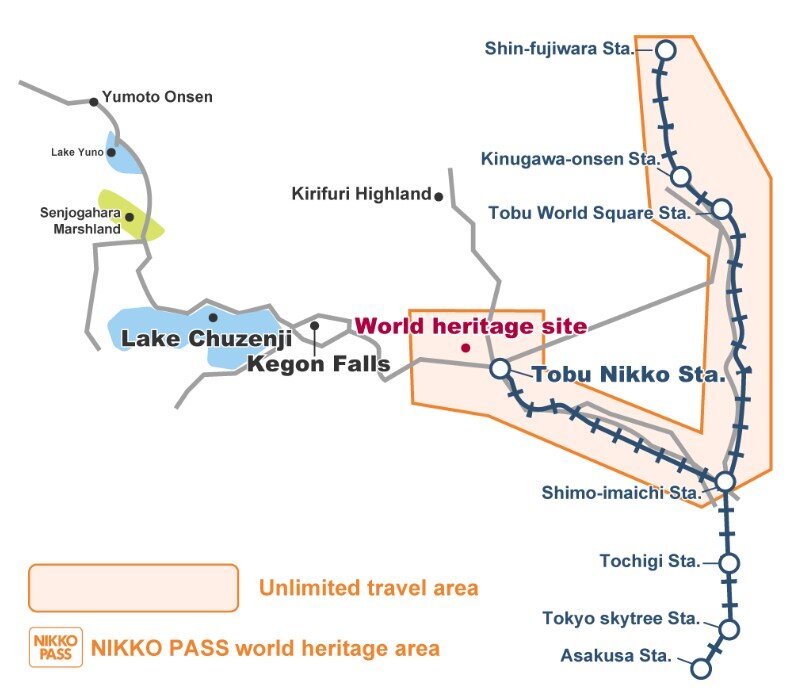 • 無限搭乘指定範圍的東武鐵道電車與東武巴士日光等交通工具。