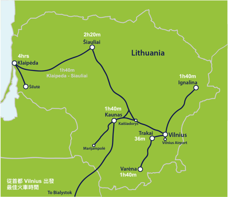 立陶宛火車通行證適用往返首都 維爾紐斯 Vilnius 的主要火車路線: